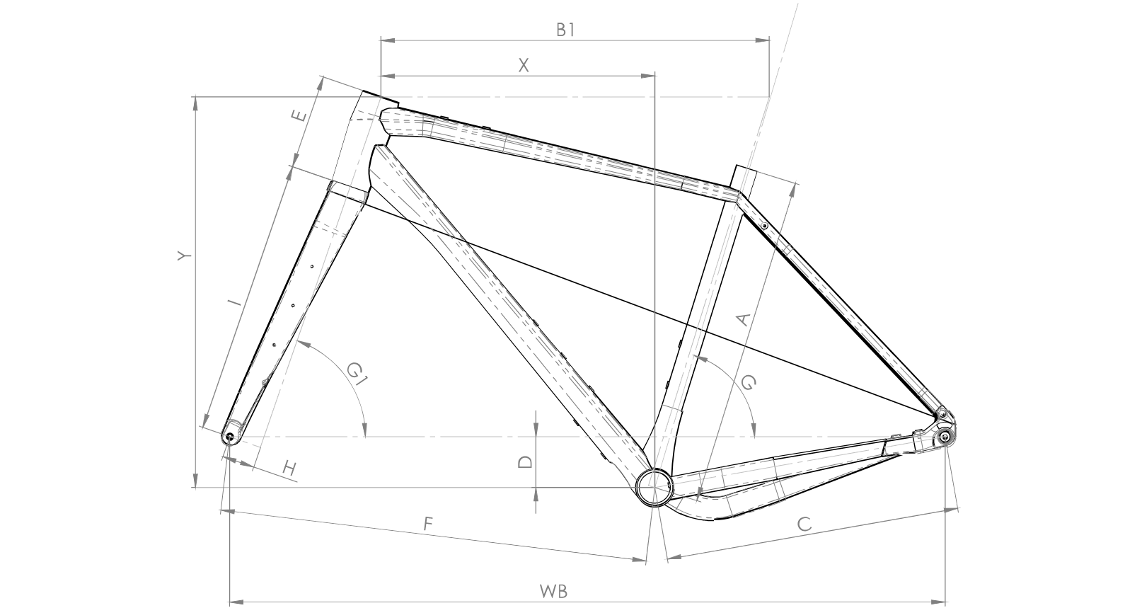 | Velikost | Seat Tube (mm) | Top Tube (mm) | Chainstay (mm) | BB Drop (mm) | Head Tube (mm) | Stack (mm) | Kot sedeža | Kot vilice | Offset vilice (mm) | Dolžina vilice (mm) | Reach (mm) | Medosna razdalja (mm) | Wheelbase (mm) |